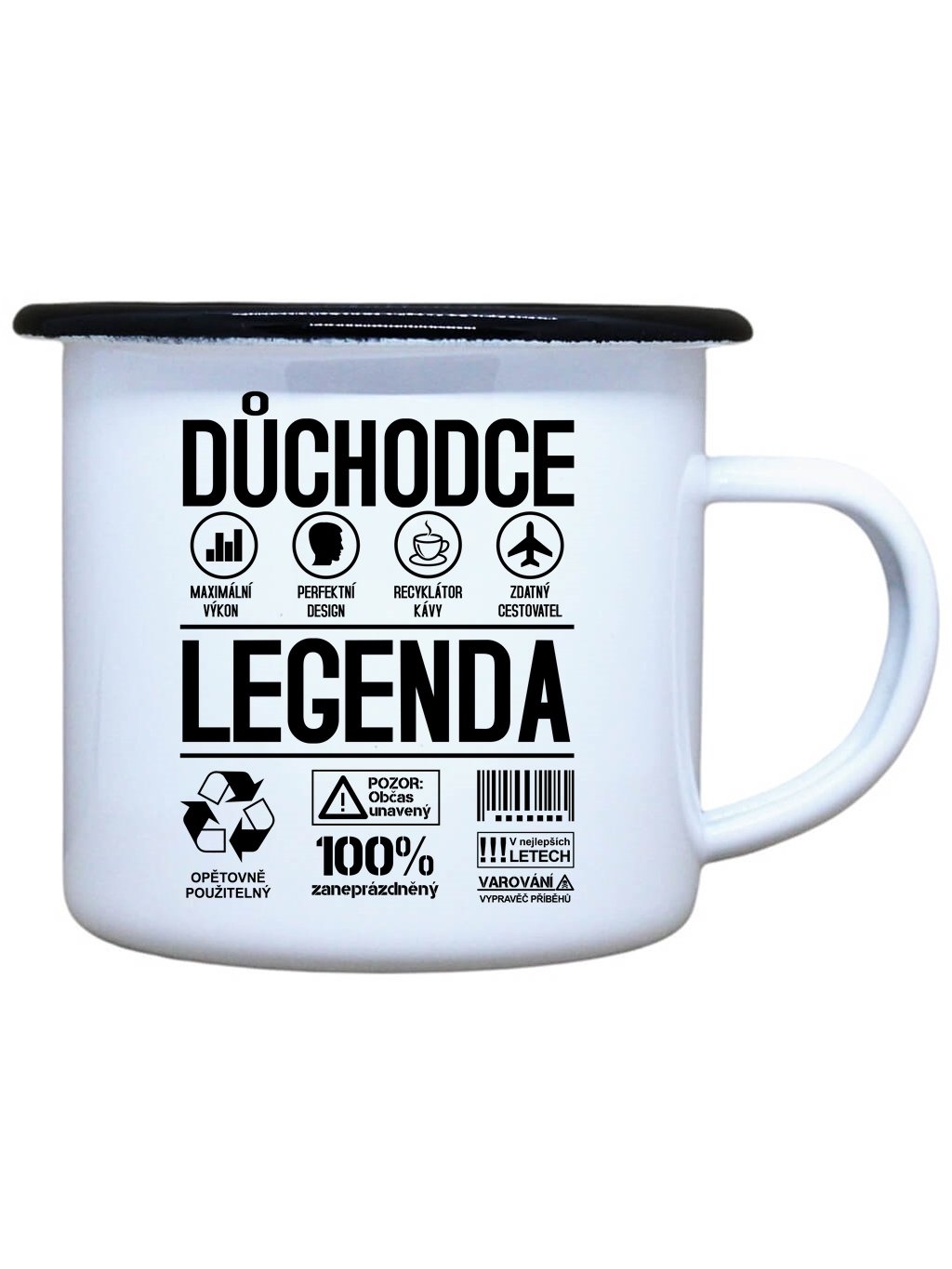 Nostalgický smaltovaný hrnek s černým okrajem z nerezové oceli a potiskem Důchodce legenda ve dvou oblíbených velikostech je ideální pro Váš čajík, kafíčko, kakao, ale třeba i na pořádný grog. Plecháček je skvělý parťák na toulky přírodou, ale i na každodenní používání ve vaší domácnosti. Neotřelý dárek nejen k svátku, narozeninám, Vánocům či Valentýnu pro důchodce.