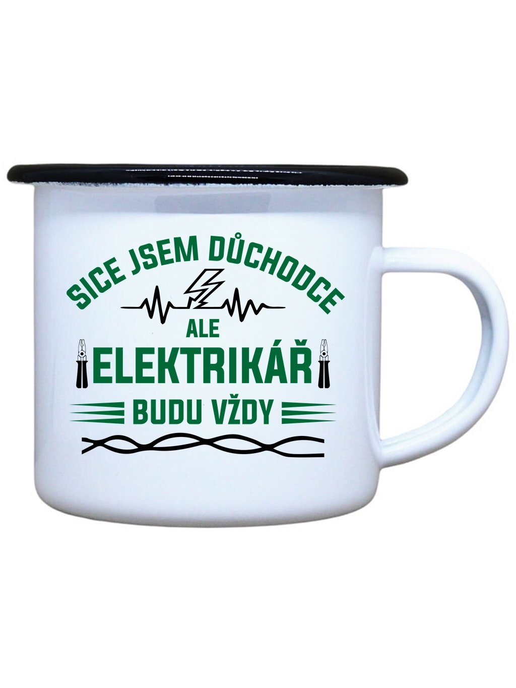 Nostalgický plechový smaltovaný hrnek s černým okrajem a potiskem Elektrikář důchodce, ideální pro Váš čajík, kafíčko, kakao, ale třeba i na pořádný grog ve dvou oblíbených velikostech. Plecháček je skvělý parťák na toulky přírodou, ale i na každodenní používání ve Vaší domácnosti.