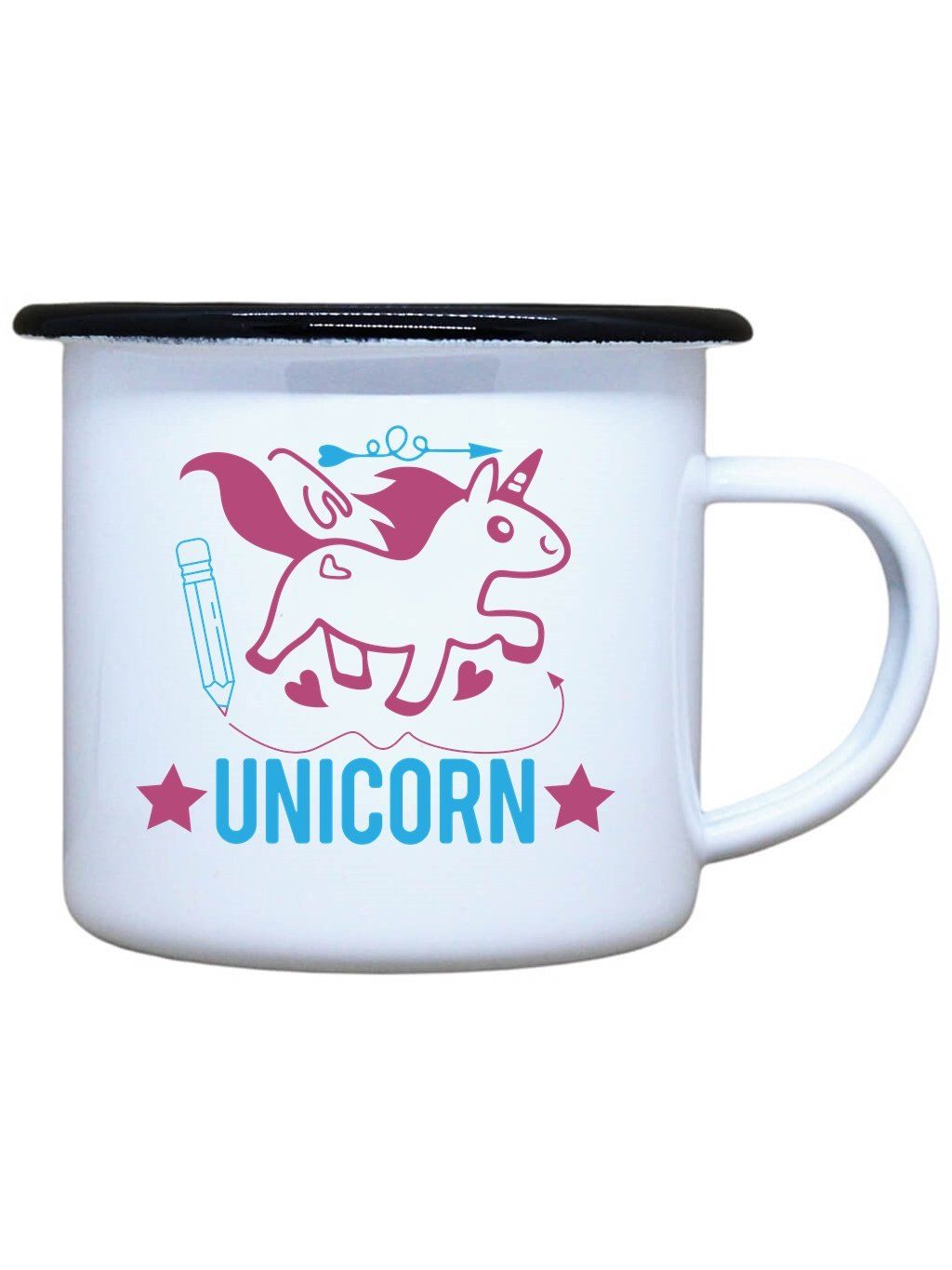 Nostalgický smaltovaný hrnek s černým okrajem z nerezové oceli a potiskem Jednorožec a tužka ve dvou oblíbených velikostech je ideální pro Váš čajík, kafíčko, kakao, ale třeba i na pořádný grog. Plecháček je skvělý parťák na toulky přírodou, ale i na každodenní používání ve vaší domácnosti. Neotřelý dárek nejen k svátku, narozeninám, Vánocům či Valentýnu pro děti.