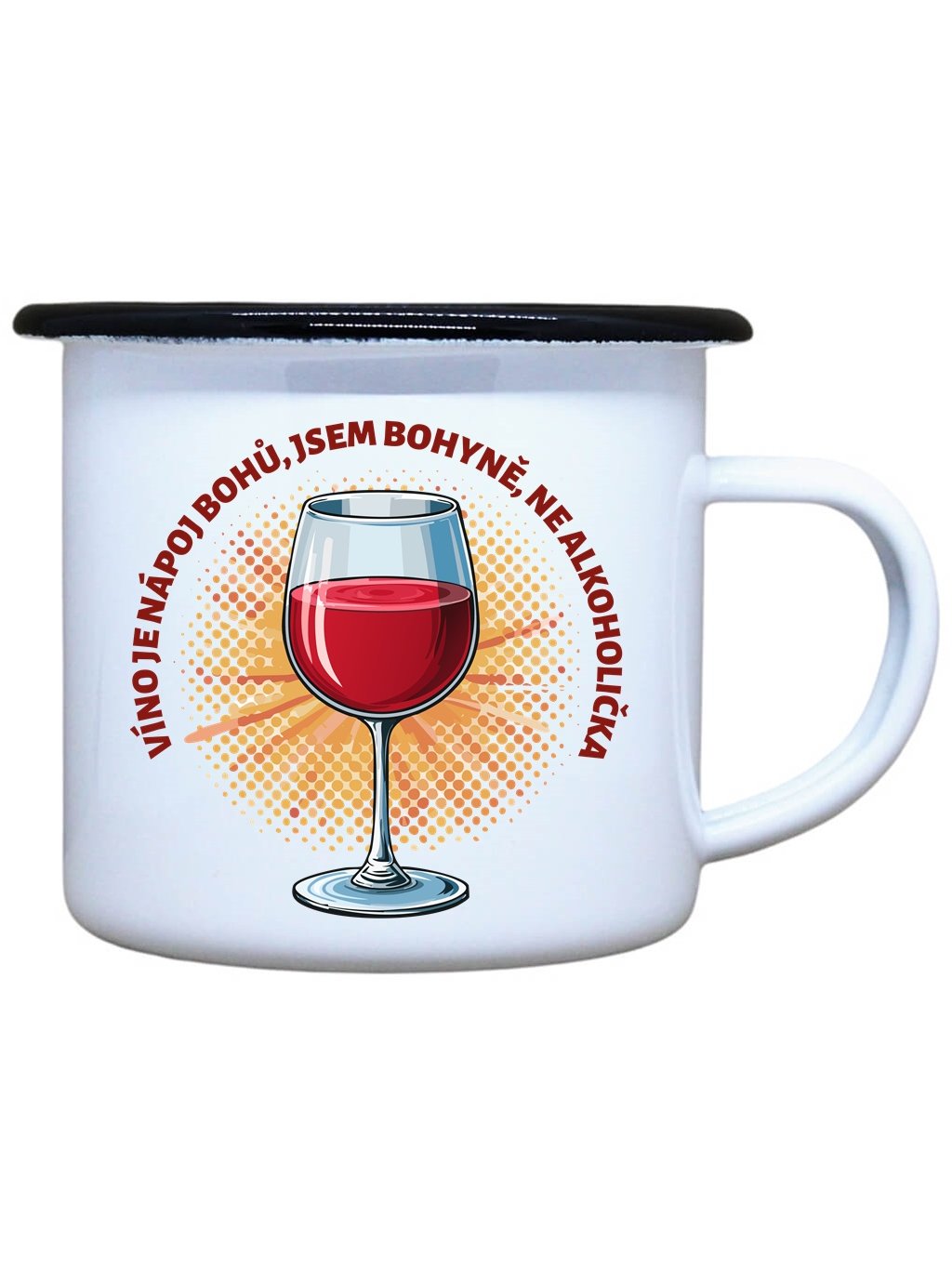 Nostalgický plechový smaltovaný hrnek s černým okrajem a potiskem Víno nápoj bohů, ideální pro Váš čajík, kafíčko, kakao, ale třeba i na pořádný grog ve dvou oblíbených velikostech. Plecháček je skvělý parťák na toulky přírodou, ale i na každodenní používání ve Vaší domácnosti.